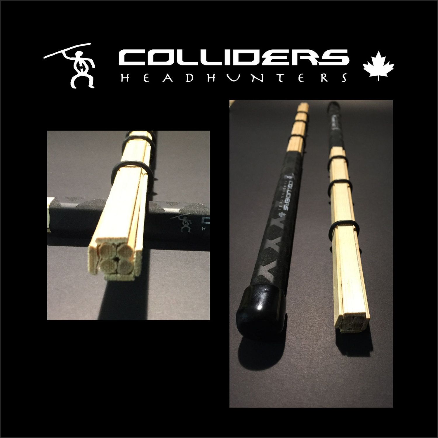 Colliders consist of 4 round bamboo centre rods surrounded by 4 bamboo slats. Three O-rings can be moved forward for a more solid sound or right back to the grip area. This allows the slats and rods to interplay and ‘smash’ into each other. The Collider name aptly describes the sound-scape of these unique specialty sticks.